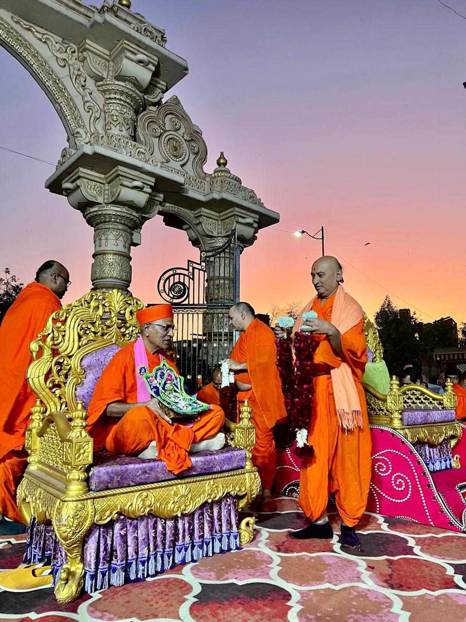 તથા પરમ પૂજય આચાર્ય સ્વામીશ્રી મહારાજ શ્રી હરિકૃષ્ણ મહારાજ સહ સ્યંદન – રથમાં બિરાજમાન થયા હતા. વિશ્વભરમાં સુપ્રસિદ્ધ સ્કોટીશ પાઈપ બેન્ડ શ્રી મુક્તજીવન સ્વામીબાપા પાઈપ બેન્ડે મધુર સૂરાવલી રેલાવી હતી. સંતો-હરિભક્તો સહ મંદિરના ગર્ભગૃહમાં પધાર્યાહતા. ત્યારબાદ પરમ પૂજય આચાર્ય સ્વામીશ્રી મહારાજે શ્રી ઘનશ્યામ મહારાજની સંધ્યા આરતી, દર્શન, ભેટણ લીલા વગેરે સ્વાગત કાર્યક્રમો યોજાયા હતા.