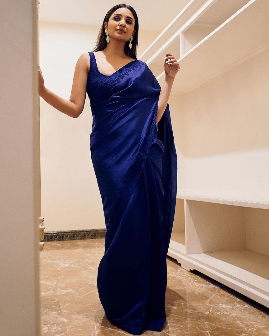 અભિનેત્રી પરિણીતી ચોપરાનો સાડીનો લૂક પણ ઘણો ગ્લેમરસ લાગી રહ્યો છે. ડાર્ક બ્લુ સાડીમાં પરિણીતી કોઈ સુંદરતાથી ઓછી નથી લાગી રહી. તેણીની વાદળી સાડીમાં હેમ પર ભરતકામ પણ કરવામાં આવ્યું છે. તેણે સાડી સાથે સ્લીવલેસ બ્લાઉઝ પહેર્યો છે. તેના બ્લાઉઝ પર પણ જોરદાર વર્ક કરવામાં આવ્યું છે.
