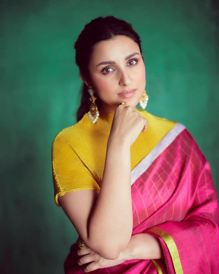 પરિણીતી ચોપરાની સ્ટાઈલ ઘણી અલગ છે. તેણે પિંક કલરની સાડી પહેરી છે. અભિનેત્રીએ ફુલ નેક યલો કલરનું બ્લાઉઝ પહેર્યું છે. તેની સાડીના હેમમાં સિલ્વર અને ગોલ્ડન રંગની બોર્ડર ઉમેરવામાં આવી છે. પરિણીતી પોતાની બહેન પ્રિયંકાને આ સ્ટાઈલમાં પાછળ છોડતી જોવા મળી રહી છે.